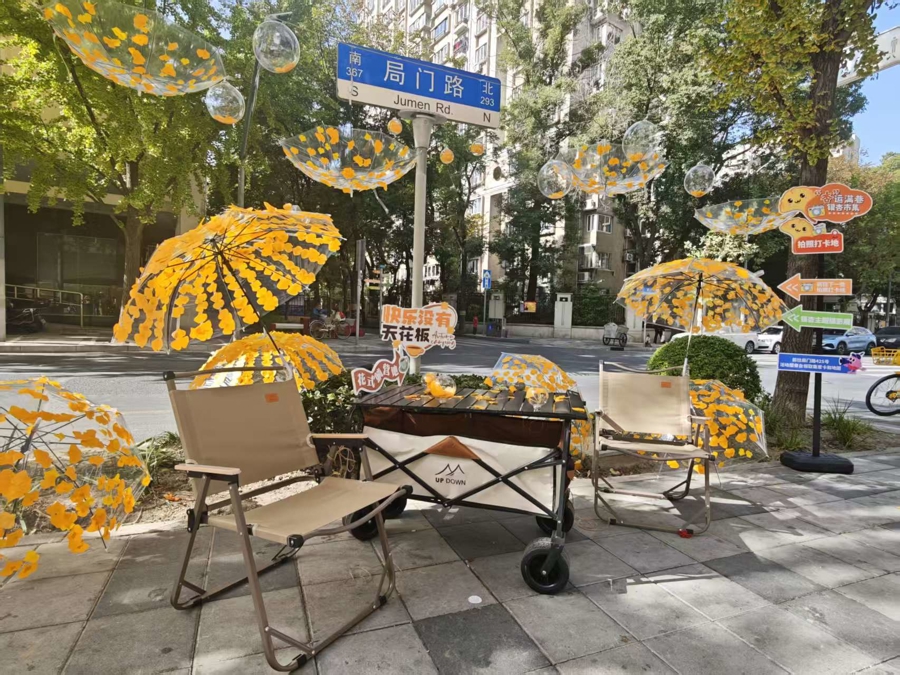 这次,五里桥街说念在瞿溪路至斜土路段顶住了三处打卡点。记者凝视到,三个场景一辞同轨放大了“金黄”这一颜色成分。如露营场景里,帐篷里的玩偶“皮肤”与落叶同色;透明雨伞上黏满金黄落叶;包裹树干的毛线以不同脉络的黄色为主;8号桥园区门口,金黄的银杏叶与红色成立墙体颜色对比横暴……